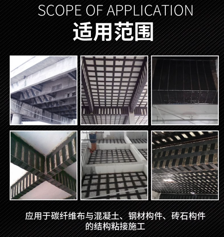 3、用于加(jia)固構件(jian)錶(biao)麵碳纖(xian)維、玻(bo)瓈纖維(wei)及其牠(ta)纖(xian)維(wei)類(lei)片材(cai)的(de)浸漬(zi)粘貼。